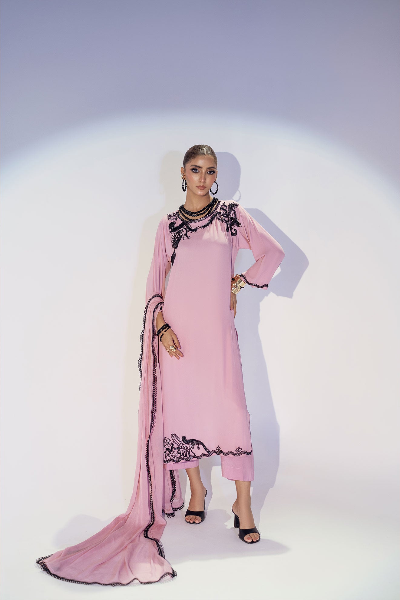 A sophisticated blend of mauve and black, this elegant ensemble features a long shirt adorned with intricate black hand embroidery that adds depth and refined detail. Paired with straight pants and a soft georgette dupatta finished with a delicate black embroidered border, this look perfectly balances subtle color contrasts with timeless Eastern charm ideal for both festive and formal occasions.